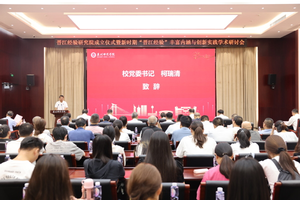 9月25日,“晋江经验”研究院成立仪式暨新时期“晋江经验”丰富内涵与创新实践学术研讨会在我校举行。中国社会科学院社会学研究所原副所长王春光研究员,福建社会科学院原副院长李鸿阶研究员,复旦大学中国式现代化研究中心主任贺东航教授,华东师范大学中共中央编译局中国现实问题研究中心副主任林拓教授,福建社会科学院习近平经济思想研究所原所长伍长南研究员,复旦大学社会科学高等研究院研究员顾燕峰,泉州市发展和改革委员会主任洪武强、泉州市社科联主席蔡琦瑜,校党委书记柯瑞清、副校长夏侯建兵等出席会议。