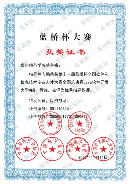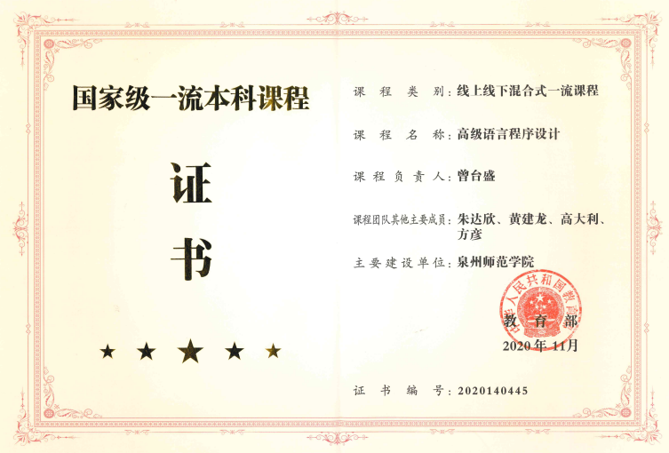 福建省高校优秀共产党员,泉州市计算机类专业优秀教育工作者,泉州市第三层次高层次人才。研究方向为图像检索、无线传感器网络、大数据,主持参与福建省高校服务海西建设重点项目《无线传感器网络技术及其在环境监测与防灾减灾中的应用》、《南音工尺谱打谱软件设计研究》等科研项目20多项,科研经费200多万,发表论文三十余篇,其中SCI、EI收录十余篇。组织、带领学生参加全国、省大学生程序设计类竞赛获得国家级奖项30多项,省级120多项。国家级一流本科课程线上线下课程《高级语言程序设计》负责人,主讲的《数据结构》课程先后获评福建省精品课程、福建省精品在线开放课程、福建省线上一流课程,主讲的《编译原理》课程获评福建省线下一流课程。